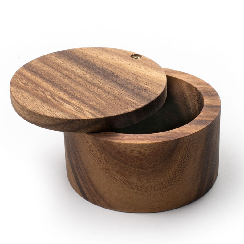 A charming means of salt storage! Made from acacia hardwood, this piece is functional and beautiful with rich, shimmering, warm wood colours, perfect for keeping sea salts (or kosher salts) - or your favourite spice blend! - within easy access. The lid swivels to the side, closing snugly to keep contents fresh.