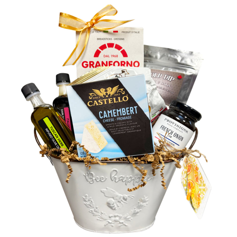 This bee-utiful, reusable tin comes with a sweet theme that is appropriately "cheese-y". Serve the brie cheese with a drizzle of the Tuscan Herb Olive Oil and Fig Balsamic all over. Top with French Onion Jam to take it to the next level. Warm in a brie baker and serve with the breadsticks. Complete your little snack with a sweet note - the mini cranberry cookies mean dessert is included with this basket!