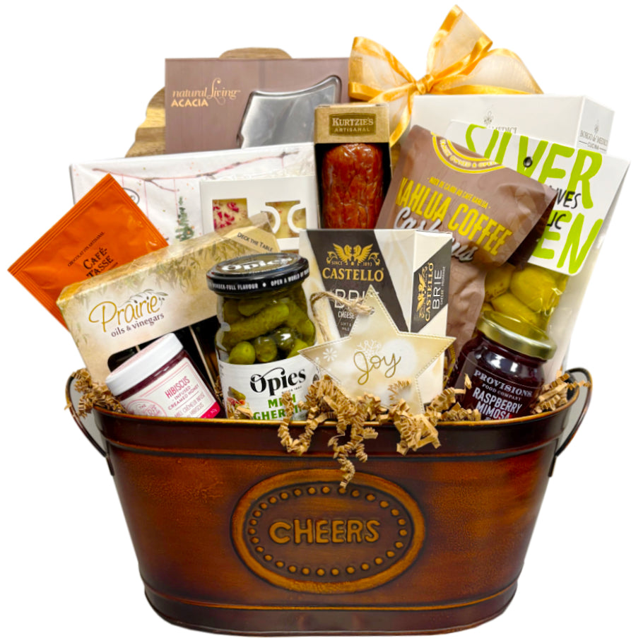 This one turned out so picture perfect, it sure makes a special statement. This basket is bursting with flavours to serve up with a special someone or put on an impressive spread for a group. We've curated the perfect spread of elevated snacking selections - all based around the statement-making Acacia Cheese Board set. Meat, cheese, crackers, jam, honey, olives, and more. It is all ready to make a camera-ready moment - and a toast to the holidays!