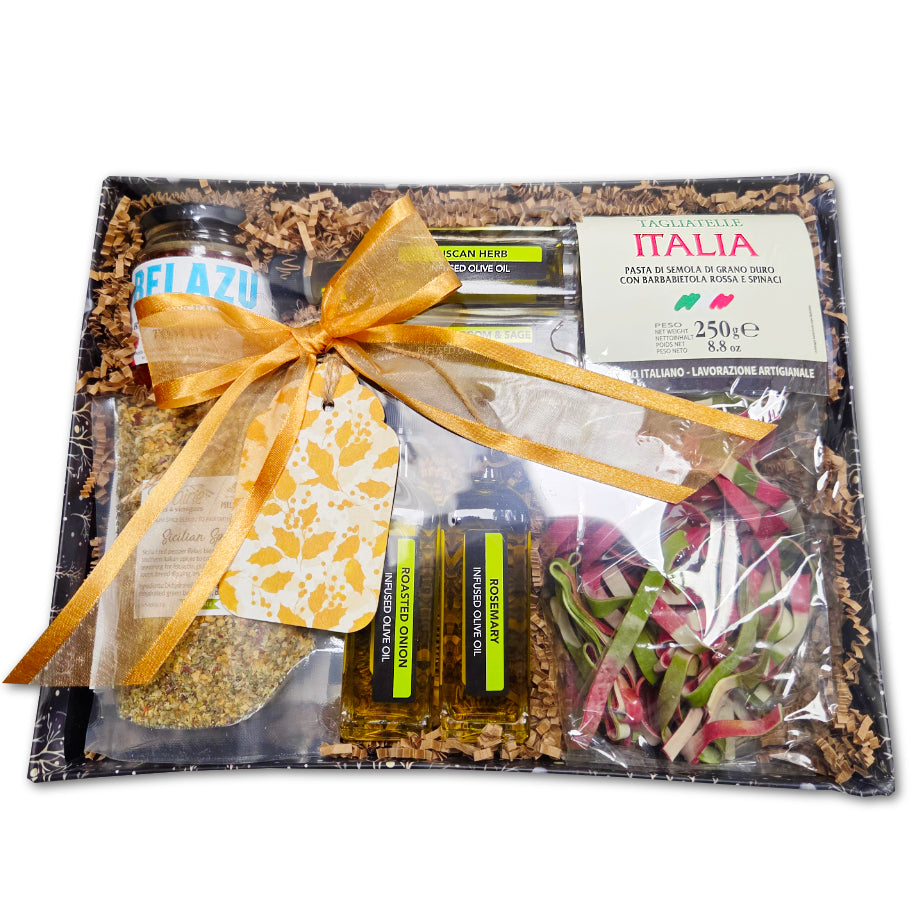 Classic Italian cooking involves classic Italian flavours. I bet you can probably almost smell them coming together, cooking down tomato sauce on the stove or an aromatic scampi sauce playing off the sweet and dusky garlic and the sharp and peppery sicilian spices. Oh my word, Italian food lovers? This basket is for you. Use the exquisitely selected FOUR olive oils to start off a variety of any of your own signature sauces and dishes, cook up the beautiful tagliatelle and be prepared to be wowed by the beauty on the plate.