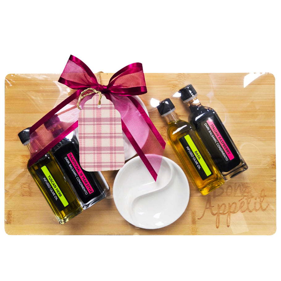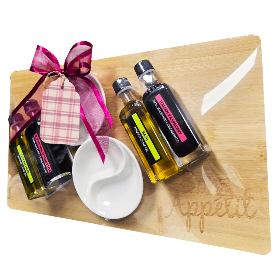 Dig in to this delectable gift set, complete with cutting/serving board and two of our most cherished oil and vinegar pairings for bread dipping. Everything you could wish for a to have a dipping good time!