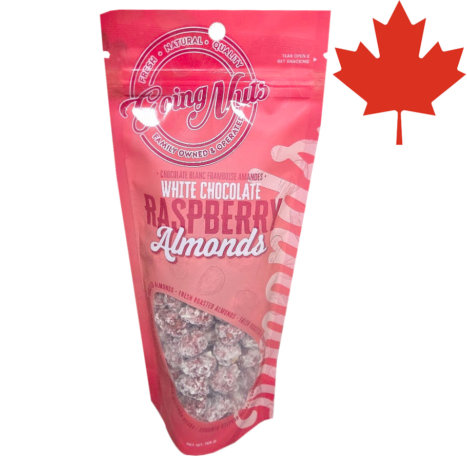 White Chocolate Raspberry Almonds: Their newest seasonal flavour creation! Ingredients: Almonds, sugar, white chocolate (sugar, cocoa butter, whole milk powder, nonfat dry milk, milkfat, soy lecithin, natural vanilla extract), honey, artificial flavour, colour
