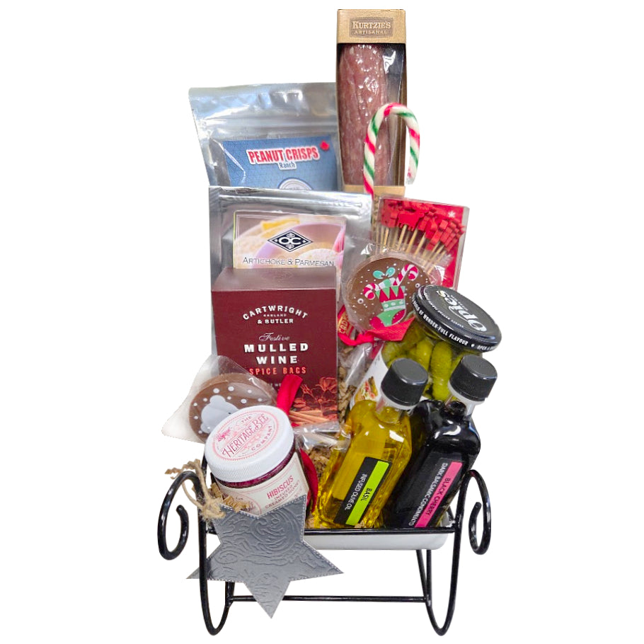 When it comes to gift baskets, this one really "sleighs"! Mull some cranberry or apple juice or wine, and enjoy a collection of easy to use, easy to love treats and ingredients for creating the best night of snacking you'll ever have. Come with a versatile collection of including both ready-to-eat items and some simple and exquisite ingredients for jazzing up a cheese plate or warm brie.