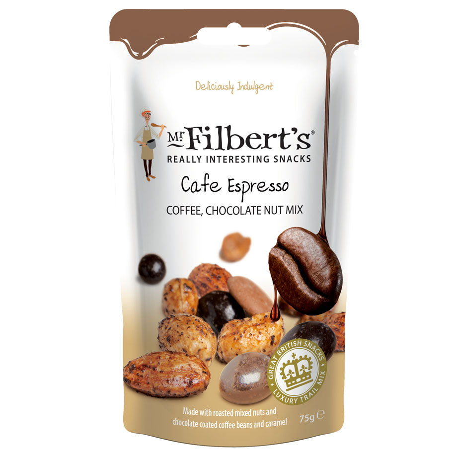 Cafe Espresso Chocolate Nut Mix - This blend combines rich coffee flavoured mixed nuts with chocolate coated coffee beans and caramel pieces to produce a delicious sweet and salty cafe snack. 100g