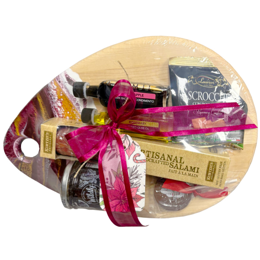 Snowed In is a charming gift package filled with a bunch of our delicious favourites for this season! Perfect for the holidays, our collection of spreads and snacks is sure to brighten your Christmas charcuterie boards. The beautiful resin serving board is perfect to serve some Artisanal Salami, or some crackers topped with the Wildly Delicious Beet & Onion Marmalade. If you were 'Snowed In', this would be the perfect snack to enjoy!