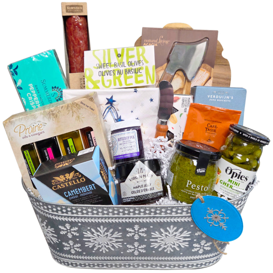 This one turned out so picture perfect, it sure makes a special statement. This basket is bursting with flavours to serve up with a special someone or put on an impressive spread for a group. We've curated the perfect spread of elevated snacking selections - all based around the statement-making Acacia Cheese Board set. Meat, cheese, crackers, jams, honey, olives, and more. It is all ready to make a camera-ready moment. All that's needed is you!