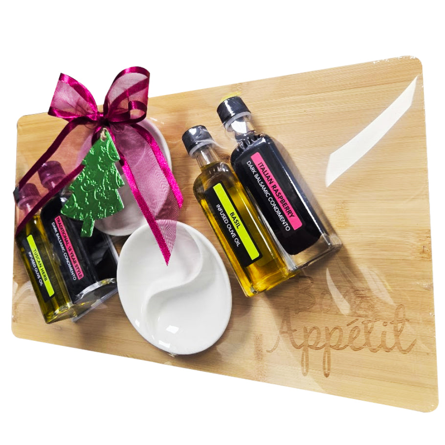 Dig in to this delectable gift set, complete with cutting/serving board and two of our most cherished oil and vinegar pairings for bread dipping. Everything you could wish for a to have a dipping good time!